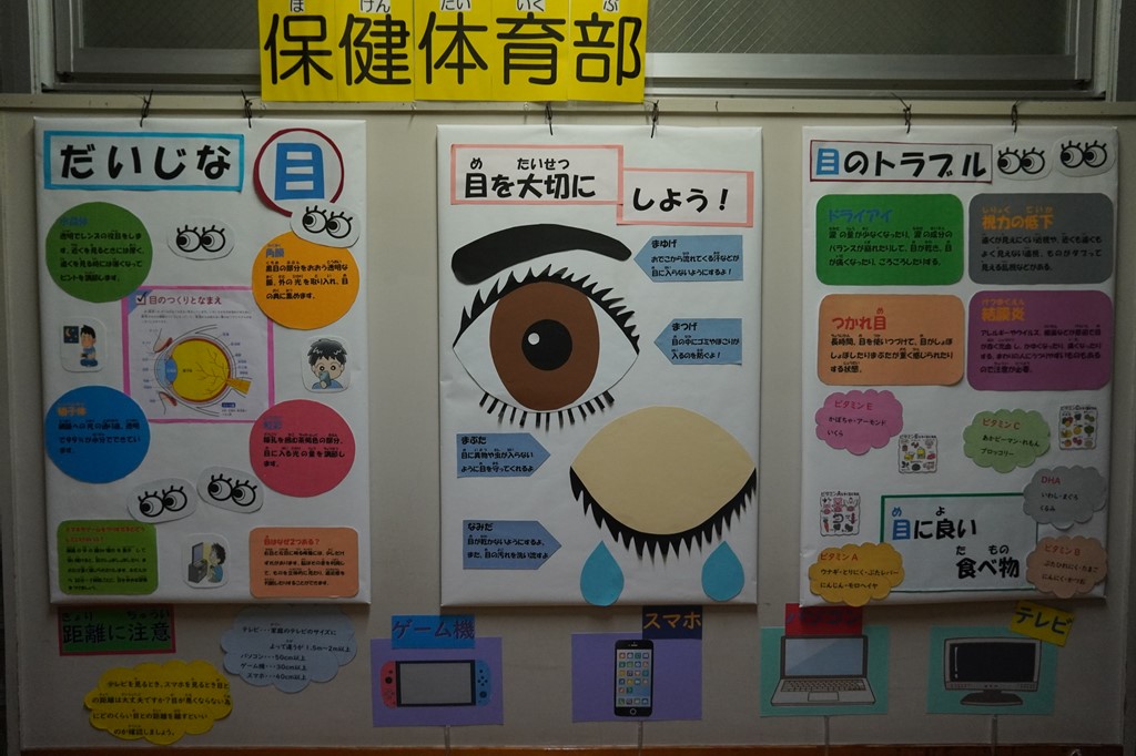 1010日の「目の愛護デー」に合わせて「目」をテーマに制作しました。内容は、目のしくみと働き、目のトラブル、目に良い食べ物についてです。また、テレビやゲームをする時は、どのくらい距離をとればよいか、実際に触って確かめることができます。配膳室前に掲示していますので、来校された際はぜひご覧ください。お子さんにもぜひ、紹介してください。
